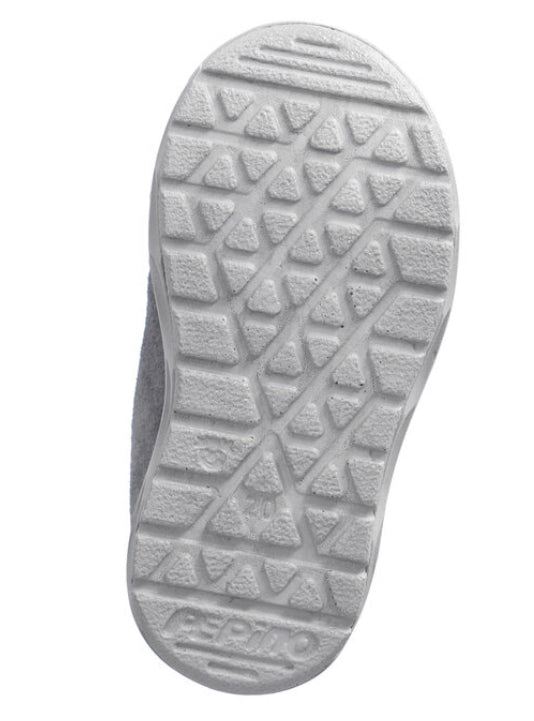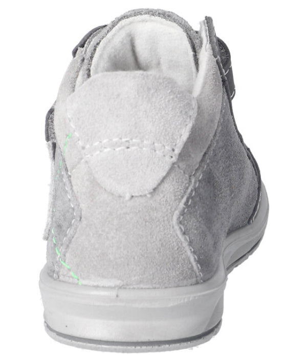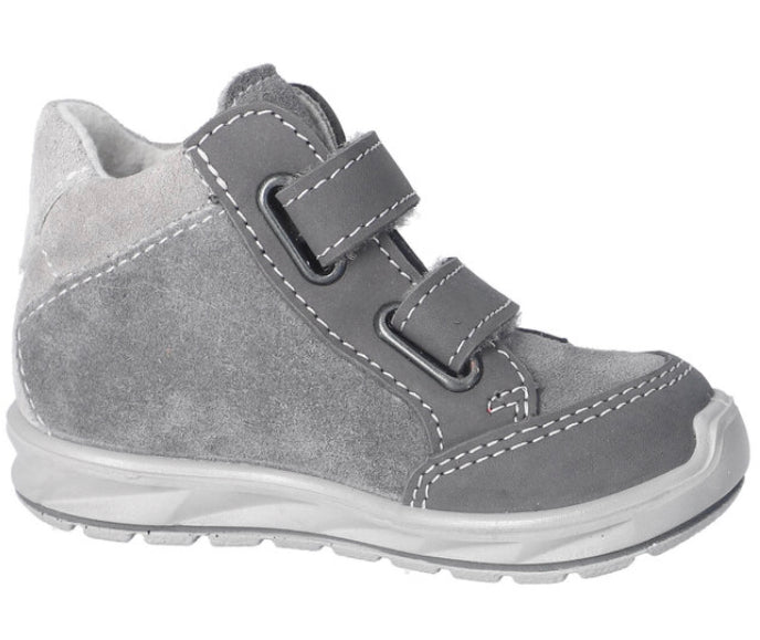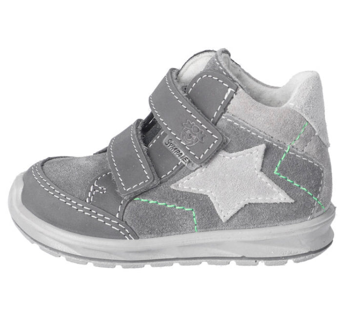 Ricosta Pepino Kimi waterproof boot in asphalt grey. In leather and durable suede. Double velcro straps, super lightweight and flexible. 100% waterproof and breathable Sympatex membrane with bellowed tongue. Padded ankle collar for comfort. Contrast stitching and star detail.
