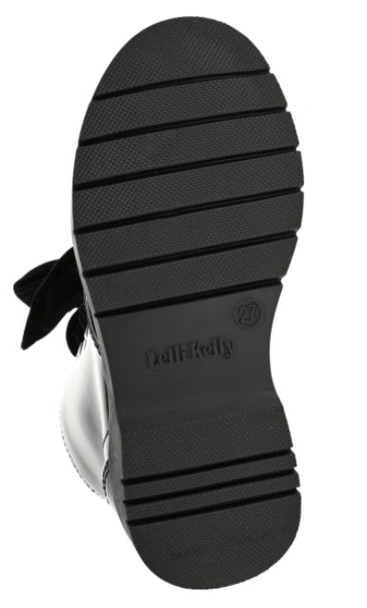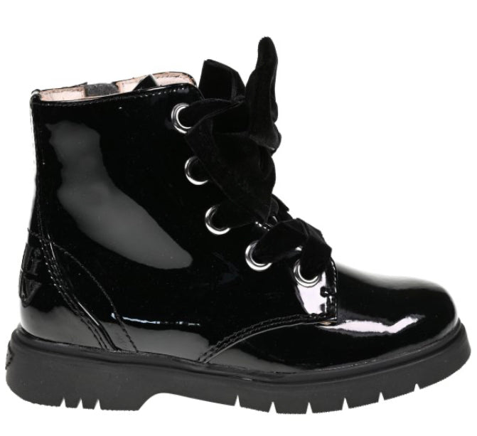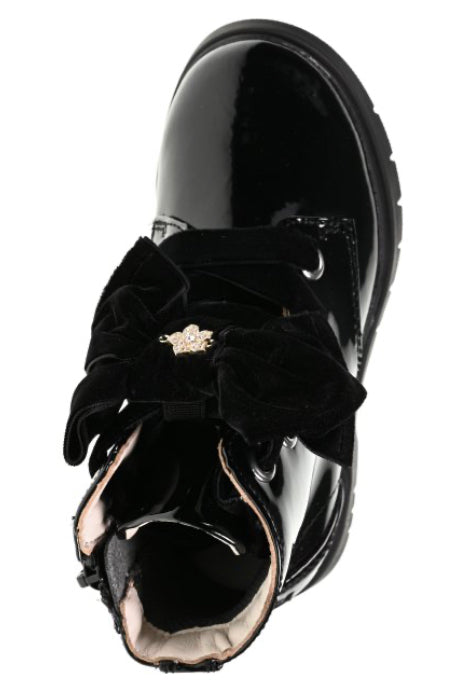 Shine with every step wearing the Fior Di Fiocco black patent boots. Black patent uppers with black velvet laces. Side zip fastening for easy on/off. A large bow sits on the front with a diamante bow in the centre. Black sole unit completes the look.