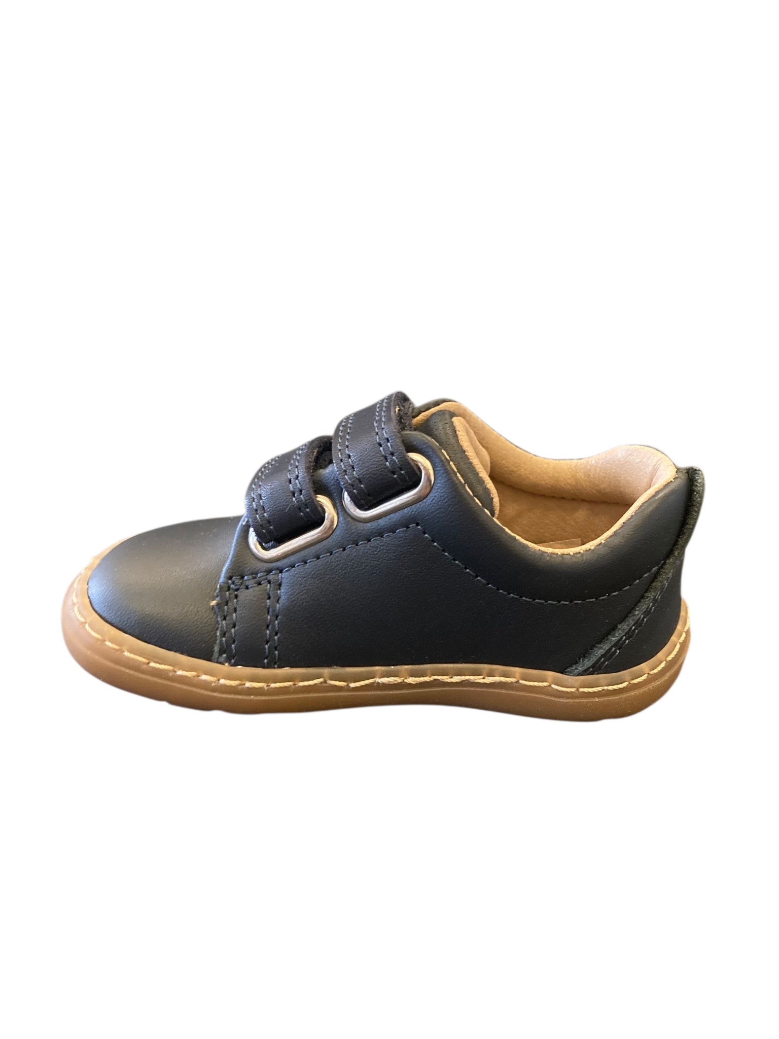 Petasil Paris in navy leather. Double velcro straps for easy secure fit. Barefoot, super soft and flexible with a wider toe box.