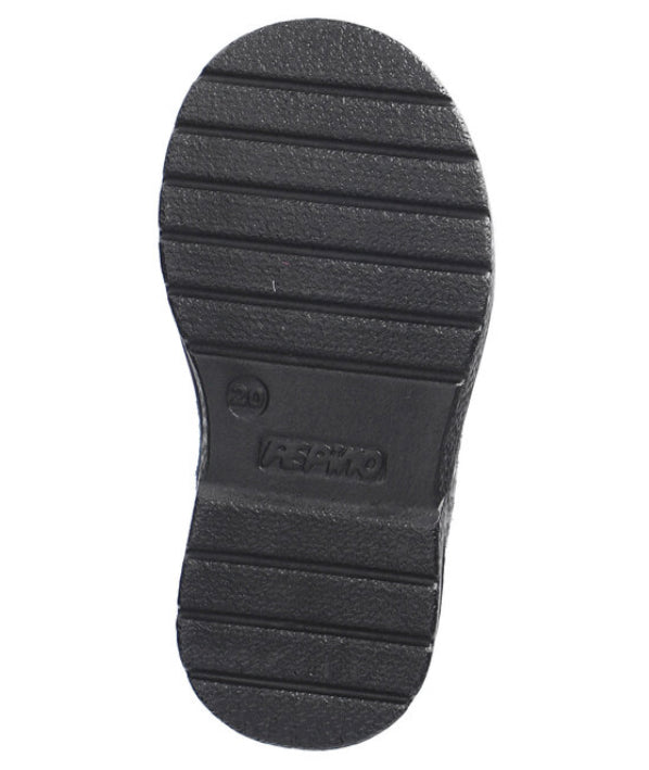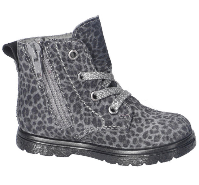 Bang on trend boot from Ricosta Pepino, the lovely Ilvy. In grey/black leopard print suede with contrast glitter laces. Fully waterproof with a sympatex membrane. Lace up style with inner zip for easy on off. Leather lined with a removable footbed.