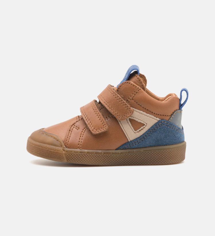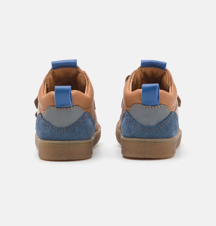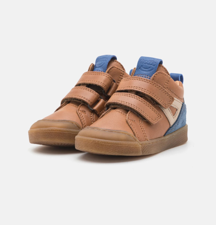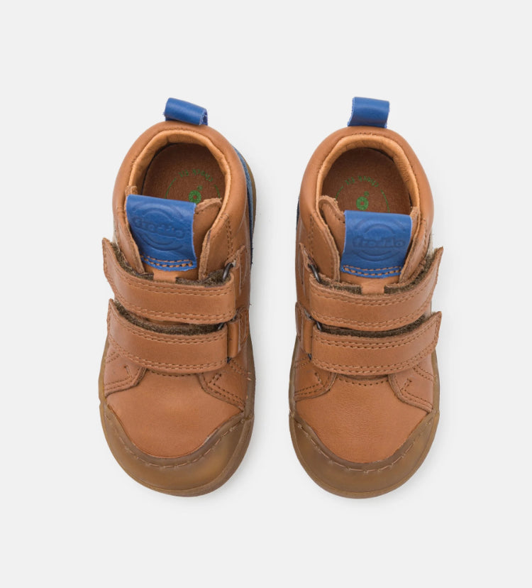Froddo Rosario boot in tan leather with blue accents. A gorgeous all purpose boot made with beautifully soft leather upper. It has a stitched rubber sole and a double velcro fastener for easy on/off. Lovely soft leather lining, padded collar and tongue for comfort, and a rubber toe bumper to help protect against scuffs. Perfect for autumn and winter.