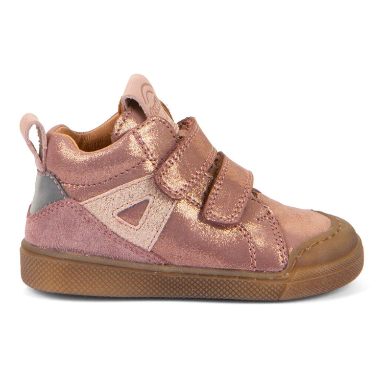 Froddo Rosario boot in stunning pink gold shine leather. A gorgeous all purpose boot made with beautifully soft leather upper. It has a stitched rubber sole and a double velcro fastener for easy on/off. Lovely soft leather lining, padded collar and tongue for comfort, and a rubber toe bumper to help protect against scuffs. Perfect for autumn and winter.